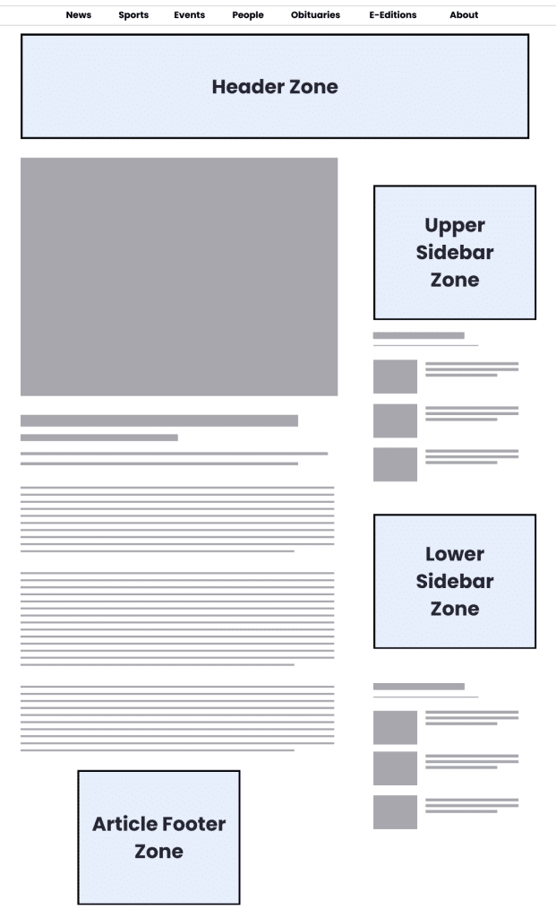 | Header ◦ Leaderboard (728 x 90) ◦ Billboard (970 x 90) Upper Sidebar ◦ Medium Rectangle (300 x 250) ◦ Half Page (300 x 600) Lower Sidebar ◦ Medium Rectangle (300 x 250) ◦ Half Page (300 x 600) Article Footer *Usually a med rectangle, but publisher can select any size. Billboard works well too. |